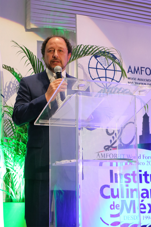 AMFORHT主席Philippe Francois为第20届世界旅游酒店业教育培训协会(AMFORHT·UNWTO)发展论坛开幕致辞,Philippe表示协会将持续致力于发展团结全世界旅游服务业,以人为本,共同进步。