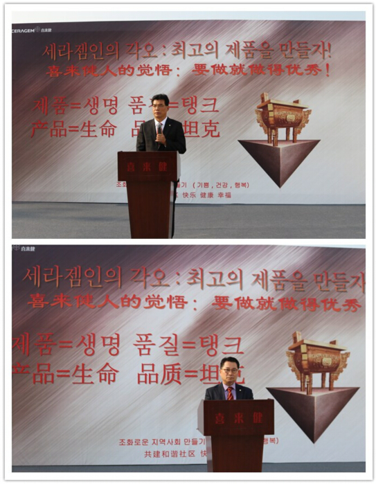 总经理李揆哲担任主持人,并强调了“产品=生命,品质=坦克”,要求全体喜来健人必须铭记在心。在会上,董事长金相植要求喜来健人不要满足于向顾客提供合格品,而是要将更加优秀的产品提供给顾客。同时希望协助业体与喜来健共同努力、相互协助,更加用心,将产品品质做到更好。相关部门负责人也纷纷在此次活动上表示:捍卫喜来健品牌,严把质量关,坚决不让一件不合格的产品运出工厂。