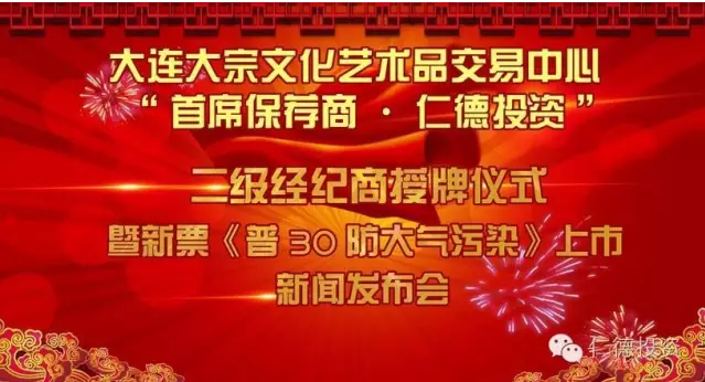 ??? 仁德集團于今年的10月27日在泉城濟南大連大宗文化藝術品交易中心首支新票《普30防止大氣污染》挂牌上市暨首席保薦商仁德投資爲二級經紀商授牌儀式隆重舉行,大連大宗文化藝術品交易中心總裁張總、副總裁李冠成、孫總等高層領導出席儀式,16家經紀商單位和二級以上代理商300多人參加了當天的儀式。