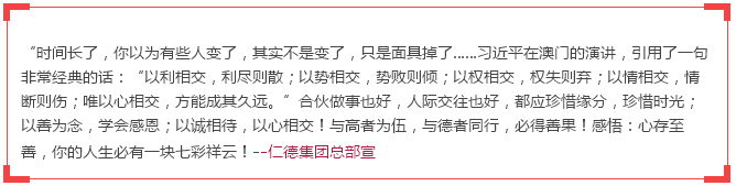 ??? 接着,李董事長又談到仁德企業的文化理念,他強調首先企業的精神是仁愛領衆,德行天下。在這幾句話中,我們也是真正做到了中國孔子教導文化的一種理念,能夠用品德做事,能夠用孝的文化傳遞一種核心的價值。他還說,在這個過程中,我們還有一個更重要的理念,就是讓天下人永遠把大衆利益放在第一位。