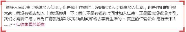 ??? 李董事長首先介紹了仁德集團的企業精神和經銷核心理念。他說,我們仁德集團是一家專業從事于房産營銷策劃的公司。注冊資金1億2000萬元,座落在美麗的山東省會城市泉城濟南。公司自創建以來,秉承着“仁愛領衆、德行天下”的企業精神,永遠把大衆利益放在第一位的經營核心理念,讓天下人安居樂業,暢想美好生活爲美好願景。在企業發展的同時,帶領無數普通大衆,在仁德平台成功創業。