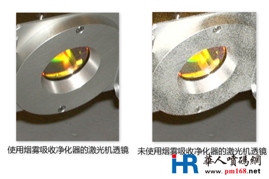 激光机重要组件透镜分别在使用烟雾吸收净化器以及未使用烟雾吸收净化器的工作环境中,不同的状态对比,可以看出在工作中,如果不使用烟雾净化器,过多的烟雾粉尘会损坏扫描头并污染透镜。