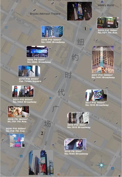▍左:时代广场第七大道719号P10LED显示屏项目,面积约500㎡;
