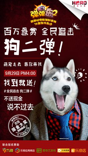 百万大奖任性送,红包拿到手发软!为庆祝《弹弹岛2》新版本今日正式上线,由英雄互娱主办,九游、乐视应用商店、爱奇艺游戏、小米直播和联想乐商店联合冠名赞助的“百万悬赏·全民追击狗二弹”活动,于今日(9月29日)下午4点—6点在北京朝阳区798艺术广场卓越艺术外墙空地处盛大开启,现场参与活动即有机会获取稀世绝版宠物以及万元现金大奖!