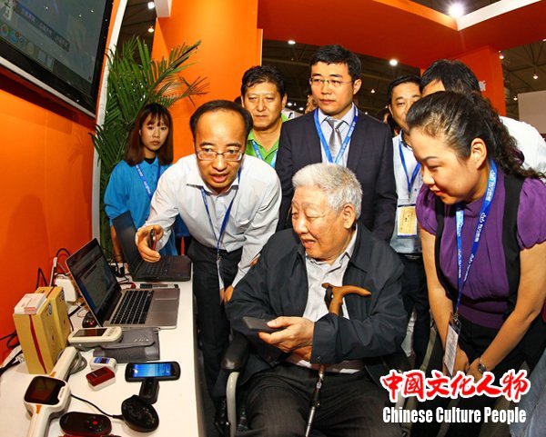 参加展览会的企事业单位代表向孙家栋院士介绍最新技术成果