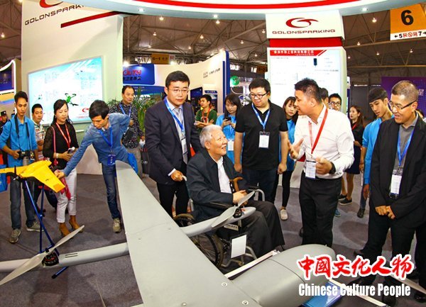 孙家栋院士在展台前饶有兴致地听取展位工作人员的介绍,并鼓励参展单位要坚定不移实施创新驱动发展战略