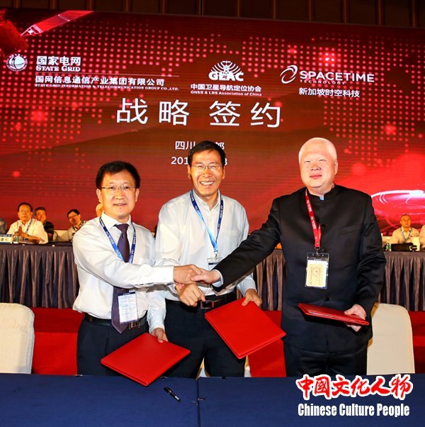 中国卫星导航定位协会会长张荣久、国家电网信通总经理、党组副书记王政涛和新加坡时空科技CEO方德发签署战略合作协议