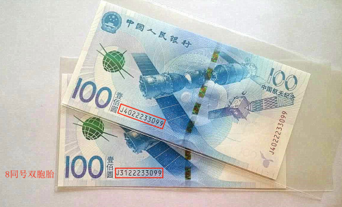 纵观我国之前发行的所有纪念钞,都已经有大幅升值,而从长期来看,航天钞是为一个为中国唯一一个事实题材的纪念钞,后期的升值也是历史的必然。加上航天钞的发行全部是打乱钱币编码发行,故此,航天钞特殊号码的钱币更是值得藏家珍藏的品种,近期宫二号的成功发射,让全球的焦点都聚集在了中国航天事业上,而作为唯一一个航天纪念钞更是受到了各地人士的关注,甚至价值也在一路飙升。