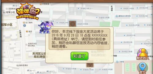 LBS系统界面 全民狂欢送大礼 不在现场?没关系!狗小弹就在你身边!为了让所有玩家都可以体验到游戏全新的LBS系统,参与到活动中来,官方特别开发了NPC狗小弹,作为狗二弹的镜像,狗小弹将会出现在每个人游戏中的LBS地图上,给玩家带来丰厚大礼,让每个人都体验到全新社交功能带来的非凡游戏感受!只要在活动当天下午4点—6点之间的打开游戏体验新版LBS功能的玩家,即可得到官方送出的价值188元的游戏大礼包一个。