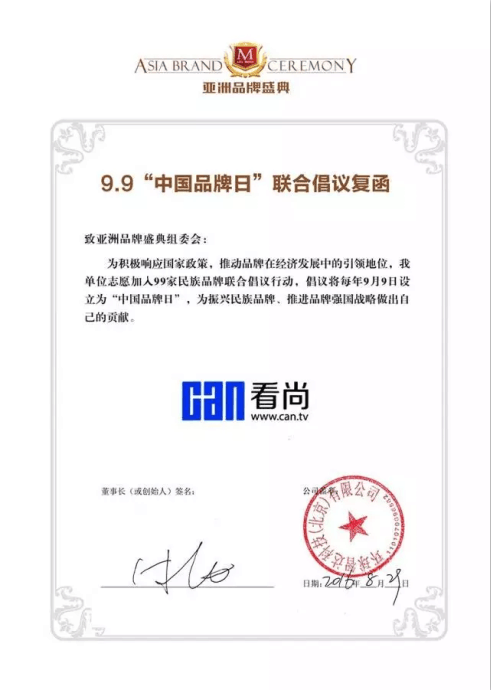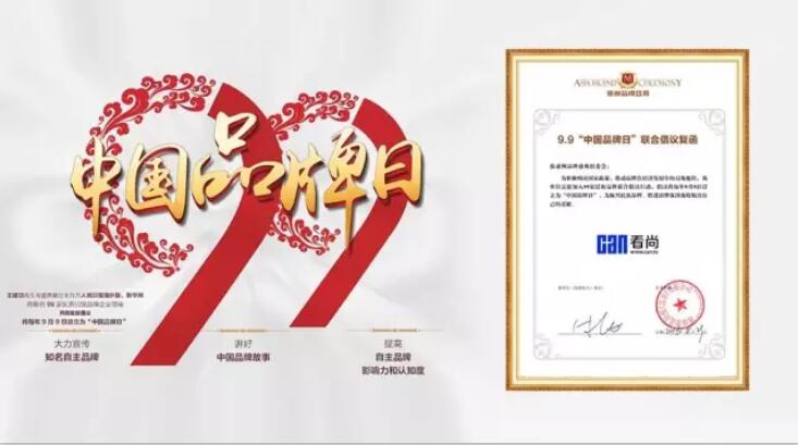 can看尚复函,确认加入9.9“中国品牌日”倡议行动。本次倡议行动将于2016年9月9日在第11届亚洲品牌盛典上举行联合倡议发布及相关活动。