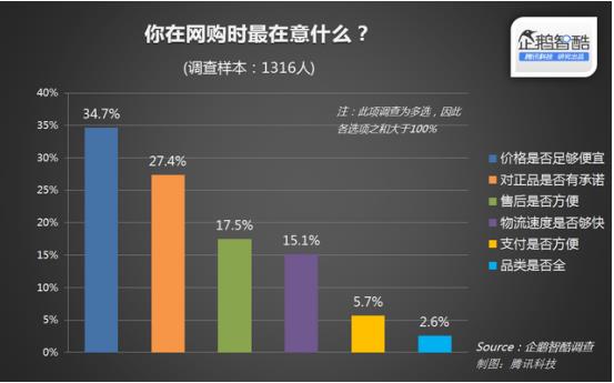 在企鹅智酷一份关于电商用户报告中显示,在网购时在意价格的用户达到34.7%,占比最高。他们所介怀的其它问题依次是品质、售后、物流、支付和品类齐全度。可见大家对网购服务的诉求相对一致。都是希望买到物美价廉的商品,即花更少的钱,获得更多的实惠。