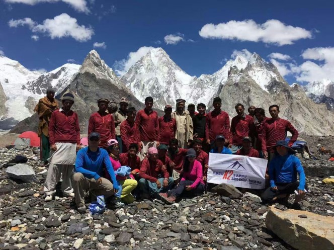 ? ? 第七天,去往K2大本营,返回Concordia,今天在这里全体队员和背夫向导,穿着TFO专业产品,以K2为背景,拍下了珍贵的纪念合影 。
