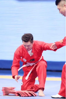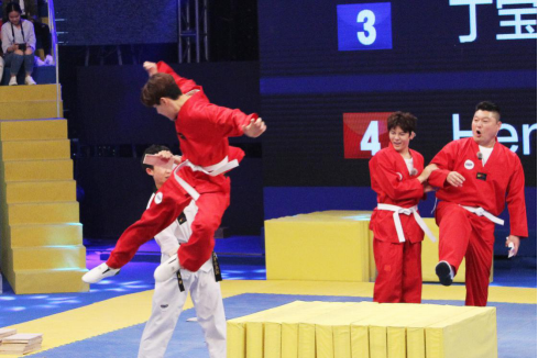在决赛的踢木板环节中,Henry与侯明昊对战两个1米9左右的大高个。第一轮踢完后,台下的对方队员夸Henry“动作很标准”;加了20厘米的宽度后,队友侯明昊失利,大家都为Henry捏一把汗,他自己也坦言“很紧张”,但最后仍完成了一个漂亮的弧线;难度越来越大,比赛越来越激烈,当他跨过了2米4的长度时,连对手都点头称赞。