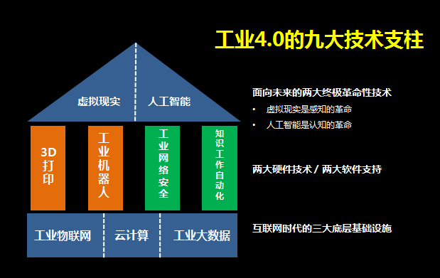 在中国制造业转型成“工业4.0”过程当中的九大技术供应商,其中包括工业物联网、云计算、工业大数据、3D打印、工业机器人、工业网络安全、知识工作自动化、虚拟现实、人工智能。