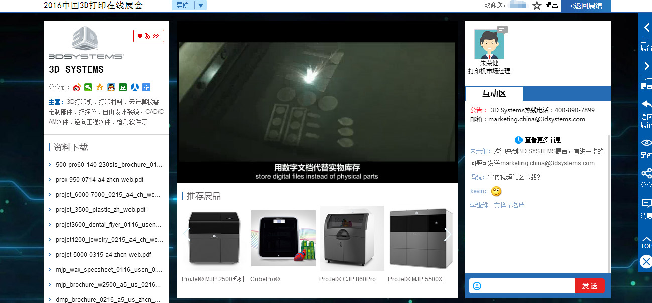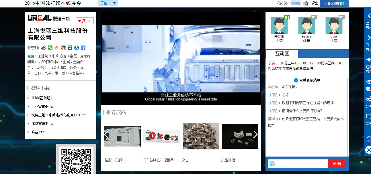 “2016中国3D打印在线展会”为参展企业分别打造了个性化独立展区,通过文字、视频、直播、白皮书下载、产品试用、有奖问答、企业名片互换等多种形式,为企业提供了全方位的形象及产品展示平台。现场观众可自由进入参展商展区,就最关心的问题与主办方一对一交流,构建合作关系。