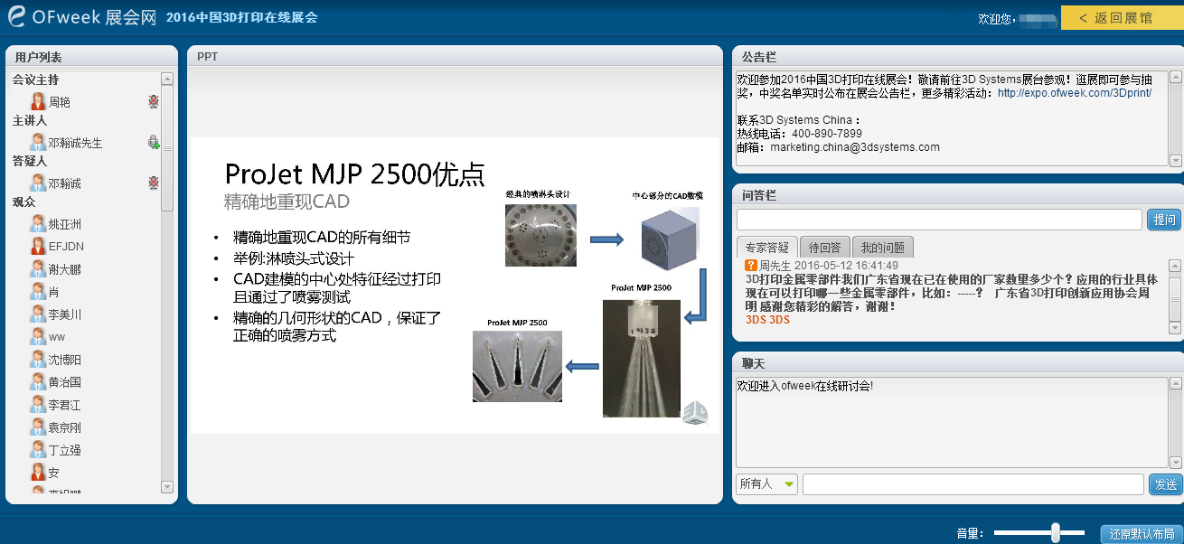 今日,“2016中国3D打印在线展”为行业带来了一场全新的“互联网+”新体验,展会现场反馈积极,气氛热烈。5月26日,本次在线展会还将持续一天,赶紧报名参加吧!http://expo.ofweek.com/3Dprint/Replay/267.html