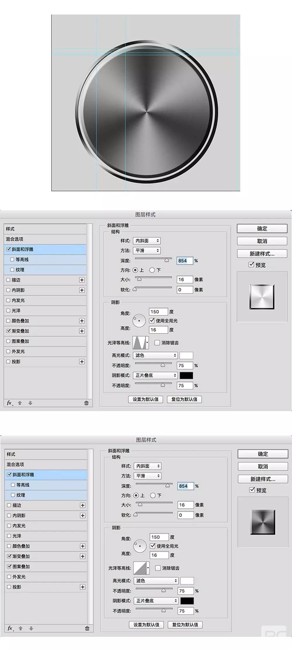 分别操作上下矩形的图层样式,调整渐变与斜面浮雕