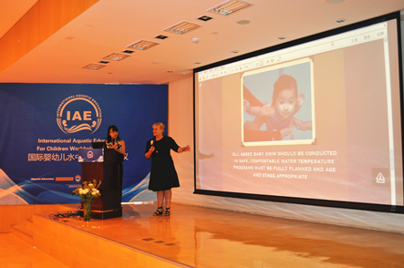 ??? 接下来,Marcelle女士近几年在东南亚的实践教学为IAE的规范和可执行性给出了具体而实际的提议。相应的,代表中国内地的婴儿游泳教学行业领袖Sunny女士?与Shane?先生也凭借着五年多的开创式成功及对中国特色的行业有着独到精准的理解,为该运动在中国的发展做了合理化建议。