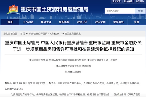 近日,重庆市国土房管局联合人民银行重庆营管部、市银监局、市金融办联合发布了关于进一步规范商品房预售许可审批和在建建筑物抵押登记的通知,通知全文如下: