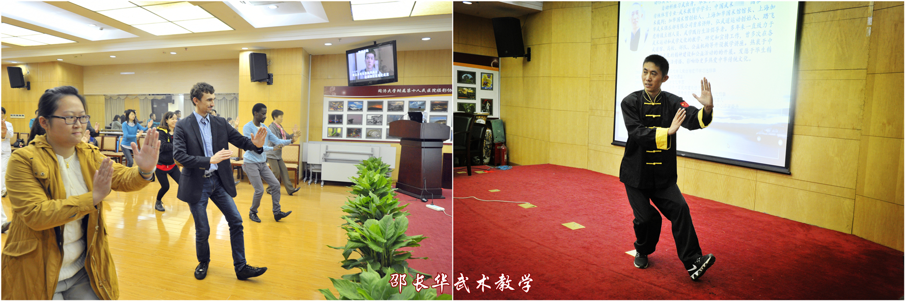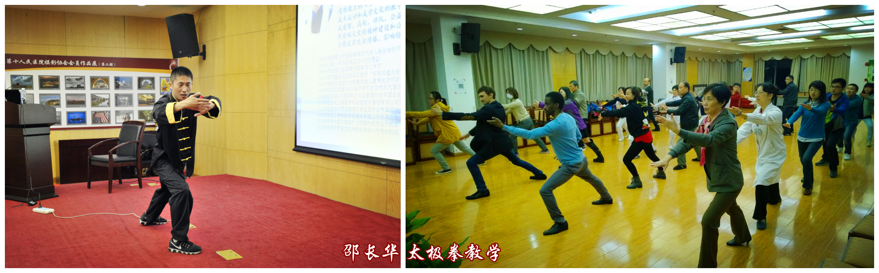 一开场,邵老师先放映了一段龙身蛇形太极拳的宣传片,深入浅出的介绍了龙身蛇形太极拳的由来。然后亲身示范的介绍了陈氏、杨氏、吴氏、武氏太极拳和龙身蛇形太极拳的本质区别。行家一出手,就知有没有,邵老师的亲身示范,大家就看懂了其中的区别和奥妙之处。然后邵老师开始教大家龙身蛇形太极拳的套路动作。由于是公益讲座而不是系统讲课,邵老师没有细扣大家的动作,而是大体的讲解让大家对龙身蛇形太极拳有一个切身的体会。现场十院的医务工作者及上海大学的几个留学生热情高涨,都对这种形式的教学非常投入,现场教学效果非常好。邵老师还在学习过程中让学员分组演练,可怜的外国友人虽然很认真,但是短时间内无法体会太极拳柔的精髓,生硬的动作惹得哄堂大笑。自己练、看队友练,这种生动的教学形式得到大家的认同,在实践中大家迈进的龙身蛇形太极拳的殿堂。