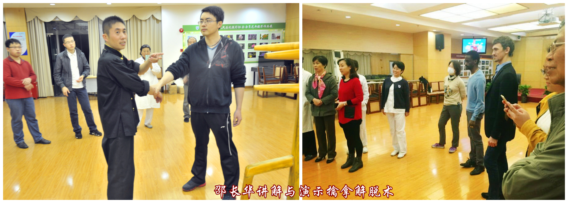 紧接着,邵老师又现场演示了咏春拳的小念头和木人桩,赢得了阵阵喝彩,现场学员们纷纷模仿邵老师的动作,体会咏春拳以小博大以弱克强的魅力。邵老师的咏春拳师承叶准大师,深得叶问系咏春拳的精髓,他介绍咏春拳的来历和实战意义字字珠玑。最后,邵老师介绍了擒拿,话不多说,现场展示。学员们两两组合,亲身体验擒拿招式。擒拿和太极咏春不同,光靠讲解和演示是没有用的,必须亲身去做,亲身去擒拿和被擒拿,才能体会擒拿动作的细节,才不会失之毫厘差之千里。从不同模块邵老师不同的教学方式来看,邵老师在武术教学上确实准备充分且精益求精。现场气氛在擒拿这一板块达到了高潮。有些上了年纪的医院员工本来是为了了解龙身蛇形太极拳来的,对格斗擒拿是有点排斥的,但在邵老师独特的教学魅力带动下,也勇于尝试擒拿动作,于是我们看到一幕非常有趣的场景:一些跳广场舞年龄的阿姨妈妈们分别上阵相互间施展擒拿且画面毫无违和感。而年轻人更是投入,两个同寝室的研究生相互擒拿的对方嗷嗷直叫,也是蛮拼的。大家沉浸在学习武术乐趣中忘记了年龄、忘记了烦恼,这就是武术的魅力。