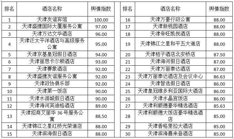 附录:9月天津地区酒店舆情指数(MCI)排名