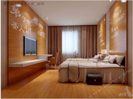 酒店的客房更是融入了国学元素和文化内涵,无论是双人间合适单人间,不仅装修风格典雅古朴,而且墙上均融入“冠必正,纽必结”、弟子规圣人训:“首孝悌,次谨信”的古训,让国学文化的传播无时无刻。