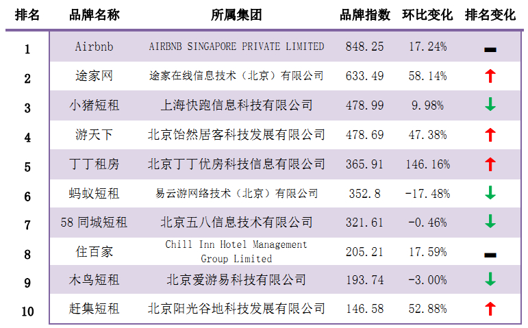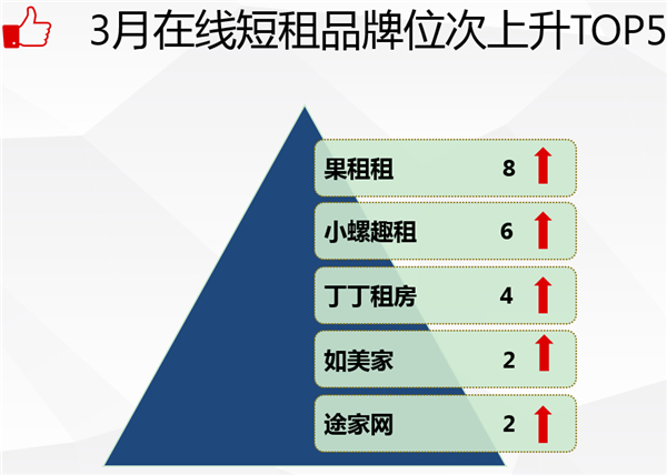 具体来看,名次上升的在线短租品牌中,果租租提高8个位次,排名第一。小螺趣租上升了6位,位列第二;丁丁租房位列第三,上升了4位;如美家及途家网均上升2位,分列榜单的第四、第五位。