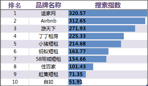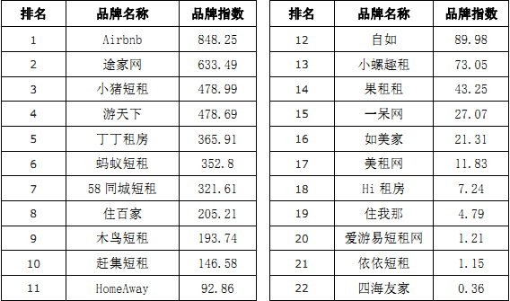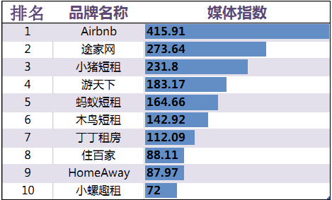 2016年3月,根据迈点旅游研究院(MTA)对在线短租品牌品牌指数的不完全统计,本月在线短租品牌风云榜TOP10依次是Airbnb、途家网、小猪短租、游天下、丁丁租房、蚂蚁短租、58同城短租、住百家、木鸟短租、赶集短租。