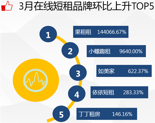 在品牌指数环比增幅方面,果租租以144066.67%的环比增幅高居榜单第一位;小螺趣租以9640.00%的增幅紧随其后,排名第二;增幅排名第三至第五的分别是如美家、依依短租以及丁丁租房,分别上升了622.37%、283.33%以及146.16%。