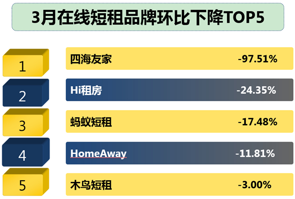从品牌指数环比降幅上来看,四海友家的下降幅度最为显著,为97.51%;Hi租房以24.35%的降幅位列第二;位列降幅榜第三至第五位的品牌是蚂蚁短租、HomeAway和木鸟短租,降幅分别为17.48%、11.81%和3.00%。