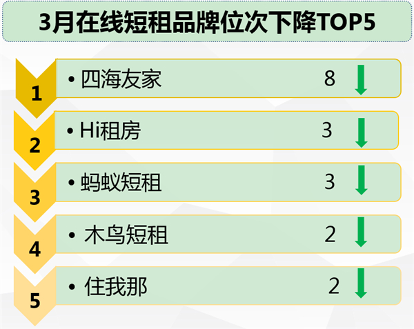 名次下降的在线短租品牌中,四海友家的下降幅度位列第一,较上月降低了8个位次。Hi租房、蚂蚁短租以3个位次的降幅位列第二、第三。木鸟短租和住我那分列下降榜单的第四、第五位,较上月均下降了2位。