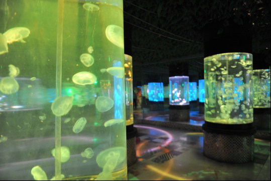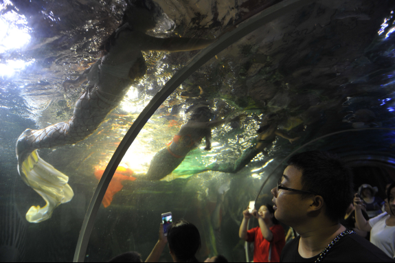 通常情况下,每日有4场美人鱼表演,3名扮演美人鱼的少女,姿态曼妙人鲨互动。另外,特为小朋友推出与海龟互动的环节,同样也是全天4个开放时间。两者集中在每天11点、13点、15点、17点前后表演,大小黄金周节假日每天各表演8场。