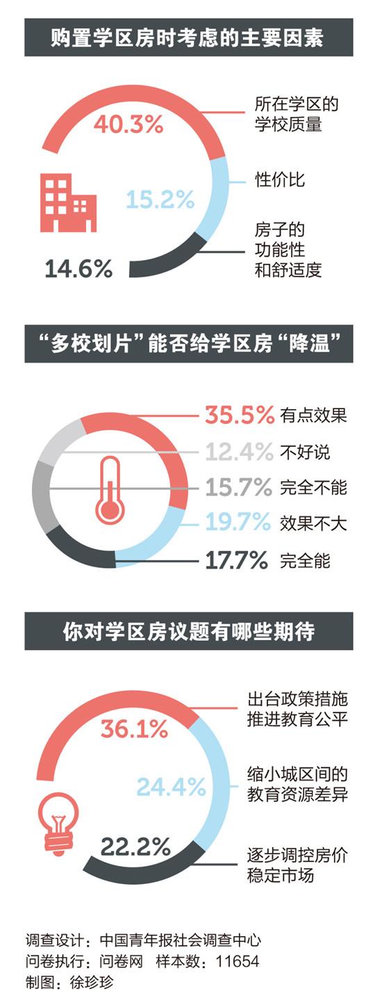 对于“多校划片”可能产生的效果,35.5%的受访者认为“多校划片”能给学区房降点温,19.7%的受访者认为效果不大,购买学区房是刚需。
