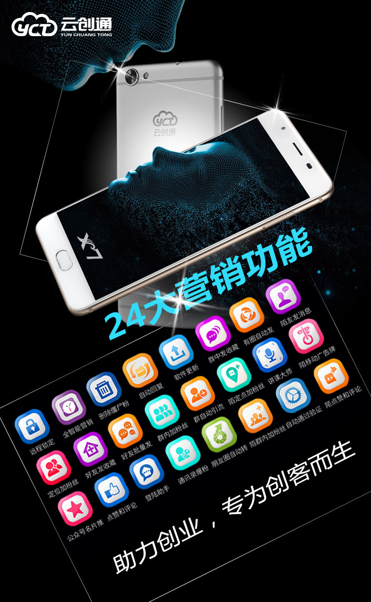 云创通智能营销手机搭载5.5英寸屏幕,1080P分辨率,八核处理器,4G运行内存,64G储存内存,运行大型游戏和5000人微信,几乎毫无卡顿,无论是日常正常使用还是作为专门的营销神器,都完全够用。同时,云创通智能营销手机更是前后搭载1300万像素和1600万像素的摄像头,还有双色温补光灯支持,拍照实力非常的抢眼,此外还有特有的美霸功能,真正的自拍神器,关注胡智强微信szhzq402而且是瞬间美颜。其中24大营销功能更是广大微商创客的“秘密武器”,全球定位加粉、微信群自动添加好友、朋友圈自动点赞评论……无需守候,云创通智能营销手机24小时为你工作,足不出户,云创通智能营销手机帮你做遍全球生意,许多功能都是目前市场上闻所未闻见所未见,功能强大到令人连连称赞,着实是微商、销售以及实体商家必不可少的营销利器!
