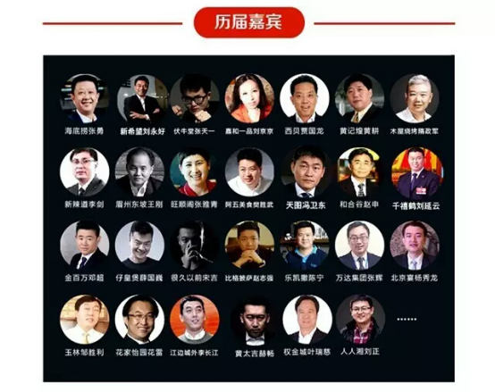 参加过历届峰会的商界巨子、餐饮领袖,大咖云集、星光闪耀。中国前首富新希望刘永好,海底捞张勇、西贝贾国龙、金百万邓超、黄记煌黄耕、新辣道李剑、眉州东坡王刚、黄太吉赫畅、天图资本冯卫东、万达商业张辉等两百多位,各企业产值加起来近万亿。
