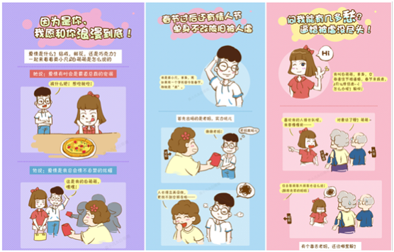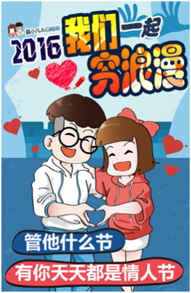 猴年春节期间,“2016单身拜拜对象快来”、“一起穷浪漫”微博话题以超过6000万的总阅读成为热议。三组分别以“单身女白萌萌”、“单身男莫小凡”春节期间被逼婚,“莫小凡&白萌萌”甜蜜恋爱事的主题漫画,将“春节逼婚”、“秀恩爱”等网友关注的热点进行了生动有趣的演绎。