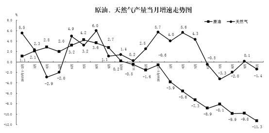 10月份,天然气产量108.3亿立方米,由9月份同比增长0.1%,转为同比下降1.4%。110月份,天然气产量1111.7亿立方米,同比增长1.9%,增速比19月份回落0.3个百分点。