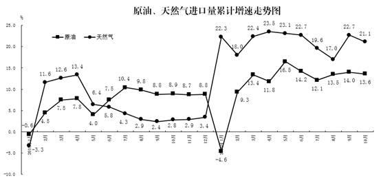 110月份,原油进口量31228万吨,同比增长13.6%,原油进口量占产量与进口量之和的比重已达到65.2%,比去年同期提高了4.6个百分点;天然气进口量4338万吨,同比增长21.1%,天然气进口量占产量与进口量之和的比重已达到35.0%,比去年同期提高了2.7个百分点。