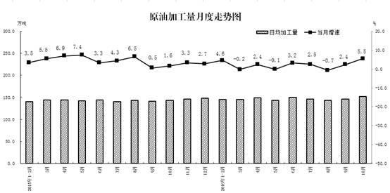 10月份,规模以上工业原油加工量同比增长5.5%,增速比9月份加快3.1个百分点;日均加工量151.8万吨,较9月份增长4.0%。110月份,原油加工量同比增长2.5%。