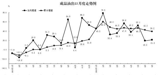 19月份,成品油(汽油、煤油、柴油、其他燃料油和石脑油)出口3405万吨,同比增长39.2%。其中,汽油、煤油、柴油出口量分别为693万吨、905万吨、1079万吨,同比分别增长72.4%、6.6%、148.2%,其他燃料油出口有所减少,同比下降4.3%。9月份,成品油出口同比增长21.2%,增速较8月份加快2.0个百分点。