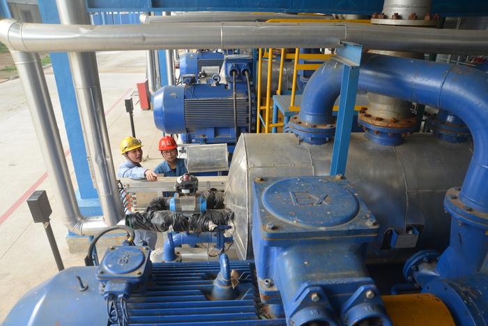 图为塑料厂职工正在检查尾气回收情况