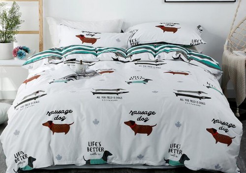 如果是家里有狗狗,或者是喜欢狗狗的人,最好不要错过可奈雅这款卡通腊肠狗款的床上用品,腊肠狗的卡通图案非常可爱,可以让房间充满童趣。