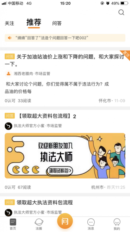 执法大师App作为、通过互联网、大数据等技术手段、依托于问答、线上培训、法律法规等模块,全力帮助市场监督管理局一线执法人员提高工作能力。目前,App内已经汇集10000余名用户,300多位行业专家、法律专家,以老带新,以点带面,让用户充分交流,快速成长。