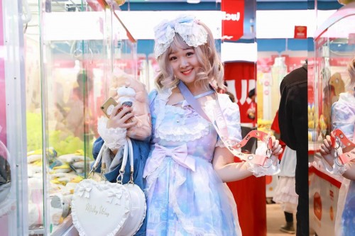 现场体验抓物机游戏的百位lo娘,无论是服饰、妆容装扮都凸显了自己的风格。据悉,Lolita(洛丽塔)服饰当成日常服来穿的姑娘,简称lo娘。Lolita的概念沿自欧洲宫廷、贵族、洋娃娃等,之后由于次元文化而在日本风靡。Lolita不仅仅是对可爱女孩的代称,更发展成为了一种独特的服装风格。通常Lolita主要以甜美、古典、哥特三大特点为主。