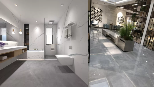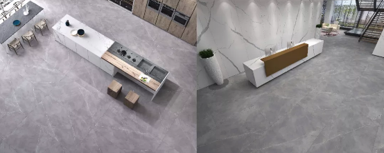 偌大的公共区域地面配上东鹏保加利亚灰,却给人以干净纯粹的感觉,同时刻画着灰色的沉稳时尚,架构着现代轻奢的气质格调,完美诠释出简约时尚不失低调内敛的空间氛围,体现出都市化社会生活的精致与个性。