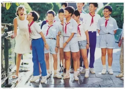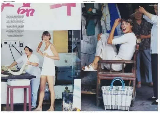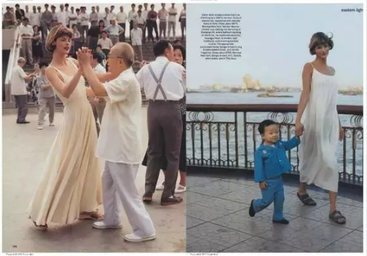 1993年12月刊美版《VOGUE》中国拍摄的女主角是第一个被称为“超级模特”的琳达·伊万格丽斯塔。图为琳达与中国广场舞大爷共舞以及琳达牵着中国小男孩。(彩蛋:这个小男孩简直和宋民国一模一样!)