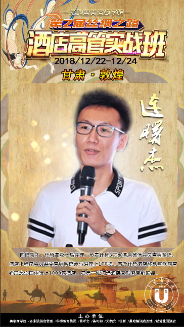 由郑叫兽美宿商学院、多米诺酒店管理、华博教育集团、易听会、荟可邦、天鹅会、住哲、曼哈顿酒店连锁集团、重庆秘境花园酒店联合主办,第二届“丝绸之路”酒店高管实战班暨易听会甘肃分会线下交流会,将于2018年12月22日至12月24日在甘肃敦煌举行。来自全国各地约400名酒店高管、业主,将会在这场行业盛典中共同探索酒店业的未来。在新时代、新经济、新理念的趋势下,把握住颠覆行业的新机遇。