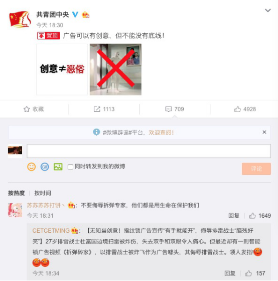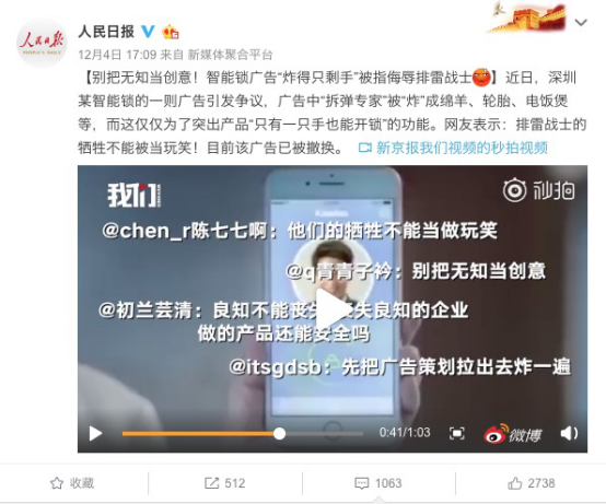 江苏省公安厅网络安全保卫总队官方微博@江苏网警12月4日发文表示,视频中,为凸显“指纹解锁”的品牌特点,不惜让排雷战士被炸至粉身碎骨,引发众网友愤怒。人民日报官微也指出,智能锁广告“炸得只剩手”涉嫌侮辱排雷战士。共青团中央更是,广告可以有创意,但不能没有底线!