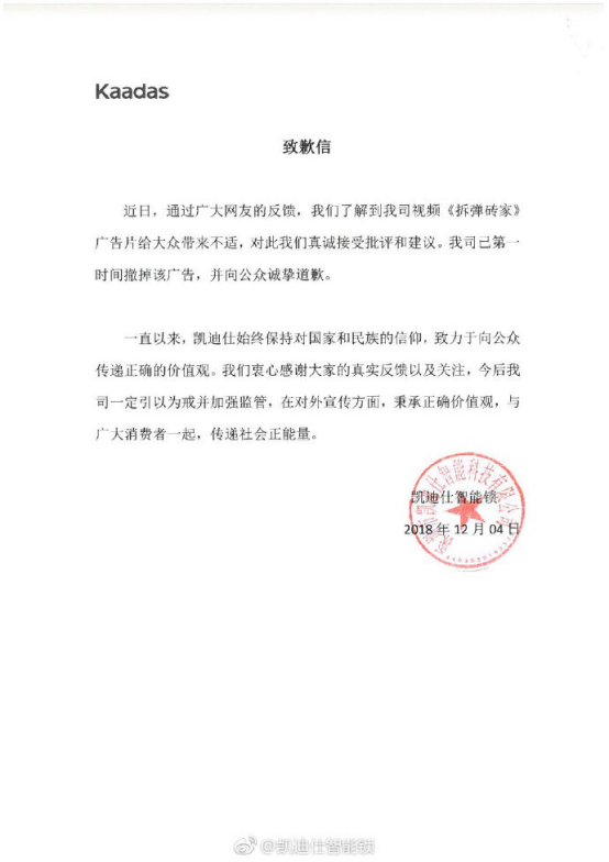 目前,争议广告涉事方深圳市凯迪仕智能科技有限公司通过其官微@凯迪仕智能锁 发布《致歉信》表示:“近日,通过广大网友的反馈,我们了解到我司视频《拆弹砖家》广告片给大众带来不适,为此我们真诚接受批评和建议。我司已第一时间撤掉该广告,并向公众诚挚道歉。”